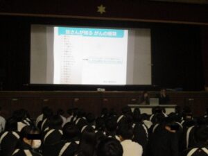 受講後のアンケートには、『家族に検診をすすめたい・自分が大人になったときには怖がらずに早く病院に相談したい』等の意見をいただくことができました!早期発見・早期治療でがんの治療成績は大きく変わります。講義の終了後に教員の先生が「なんで今、この授業を受けると思う?君たちは今からの人だから。しっかり生きてほしいから。」と生徒にメッセージを残していただき、私の胸にもグサっと刺さりました。![]()