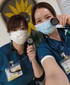 2年目看護師は先輩方や看護師以外のスタッフにも支えられながら、毎日看護を行っています。そのような環境で看護ができることに感謝し、患者さまに安心して入院生活を過ごしていただけるよう、自己研鑽に努めていきます!