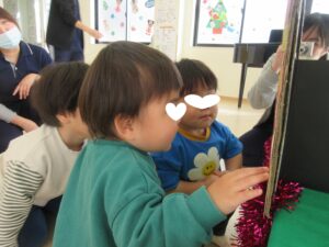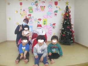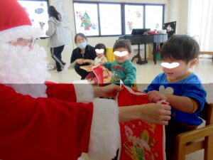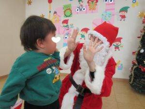 初めは驚いていた子ども達もサンタさんとハイタッチをしたり、膝の上に座る子もいるくらいでした👏