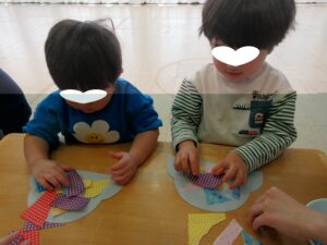 好きな柄の折り紙を貼り合わせ、完成した物を見せ合いっこ🚙🐻