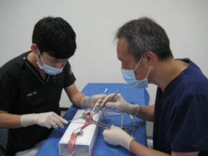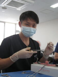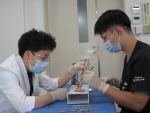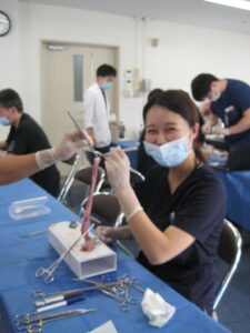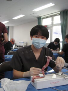 豚の食道を用いて実際に吻合を行い、最初は針の持ち方ひとつにも戸惑いましたが、繰り返すうちに少しずつコツを掴み、形になっていくのが嬉しくてたまりませんでした。
